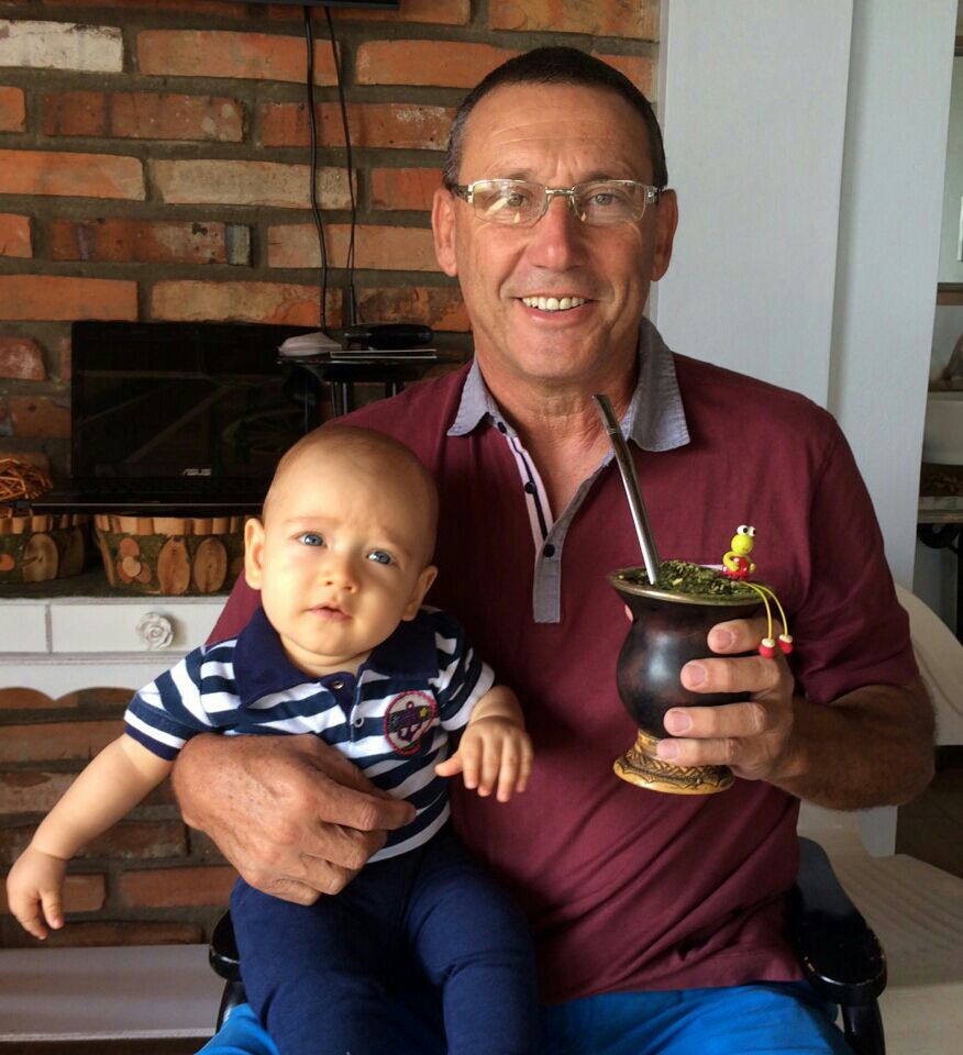 O vovô Air Menezes tomando chimarrão com o netinho em Campo da Estância (RS)