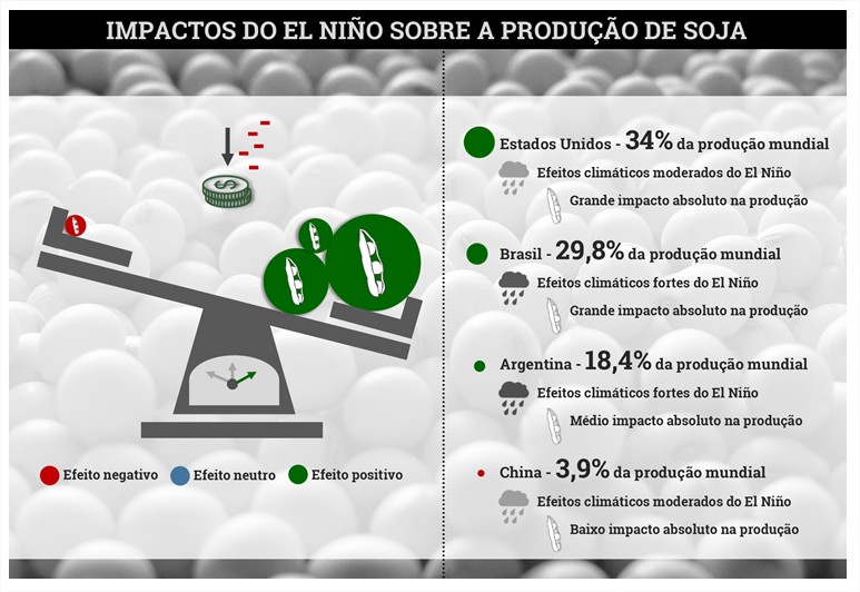 Em cenário de estoques folgados tanto para a soja como para o milho, a ocorrência do El Niño significaria um uma queda ainda maior no patamar de preços das commodities. Segundo estudo realizado pela consultoria INTL FCStone, o fenômeno tende a ser favorável à produção de grãos nos EUA, no Brasil e na Argentina, países que possuem grande participação na produção mundial do cereal e da oleaginosa. “O El Niño vai levar os preços da soja bem mais para baixo”, afirma a analista da consultoria, Natalia Orlovicin.