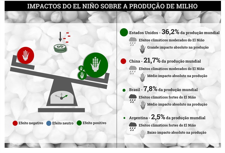 Os Estados Unidos, maiores produtores mundiais de soja e milho, respondem por 34% e 36,2% da produção global, respectivamente. Considerando a ocorrência de feitos climáticos moderados do El Niño, o país registraria grande impacto absoluto na produção, com efeito positivo sobre a safra. “O fenômeno climático diminui o risco de secas muito prolongadas durante os meses de junho e julho, com volume de precipitações adequado ao desenvolvimento da safra”, explica, em relatório.