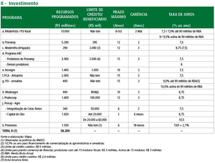 Para o financiamento de custeio a juros controlados estão programados R$ 94,5 bilhões, 7,5% a mais em comparação com o período anterior (R$ 87,9 bilhões) e reflete o crescimento dos custos de produção. Já para investimentos, são R$ 33,3 bilhões.