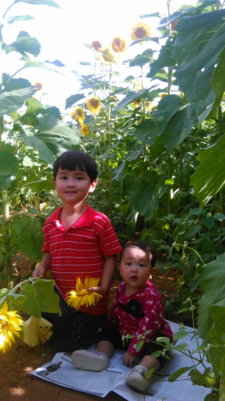 Caio e Branca na lavoura de girassol na região de Luziânia (GO). Envio de Elcio Sakai