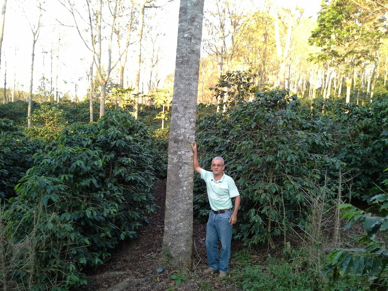 Produtor Sebastião Araújo de Oliveira, em sua lavoura café consorciado com Cedro Australiano com 10 anos de idade. Região de Senhor de Oliveira (MG)