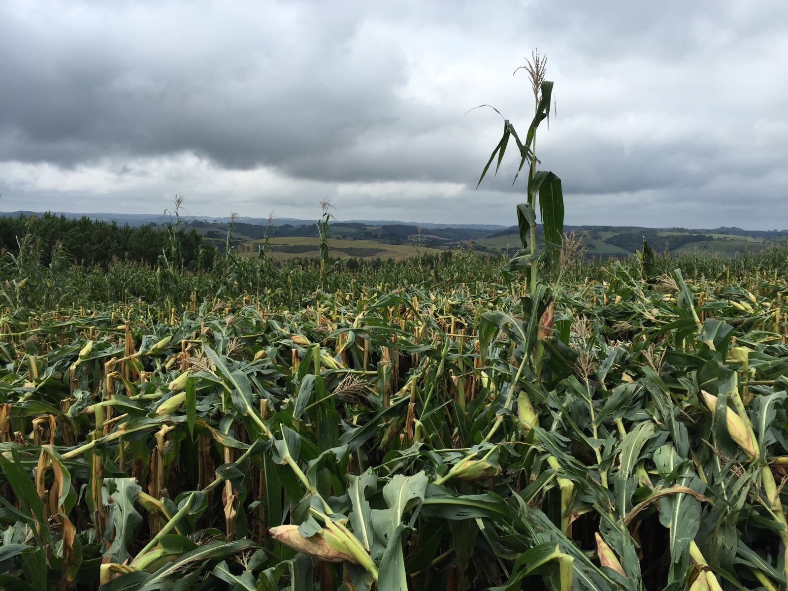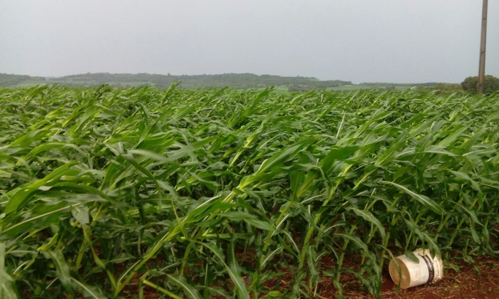 Lavoura de milho safrinha em Marechal Candido Rondon (PR), após vendaval de 70 kmh. Envio de Renato Wiebrantz.
