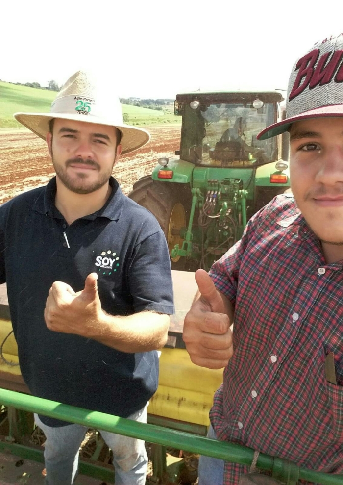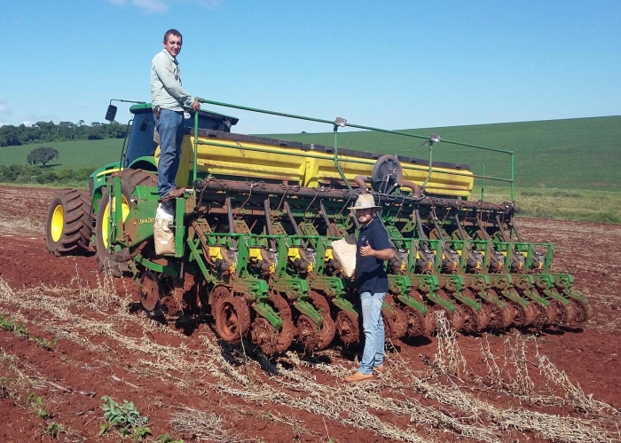 Vanderlei Gomes e Paulo Reis no plantio de milho safrinha em Santa Cruz do Rio Prado (SP)