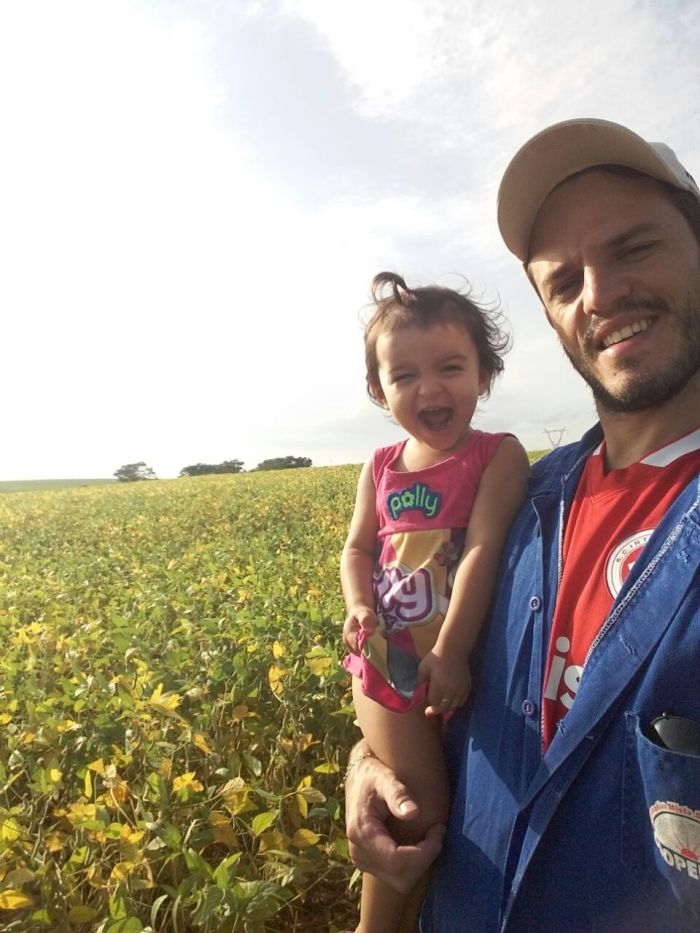 Ana Laura com o pai na lavoura de soja em Giruá (RS)