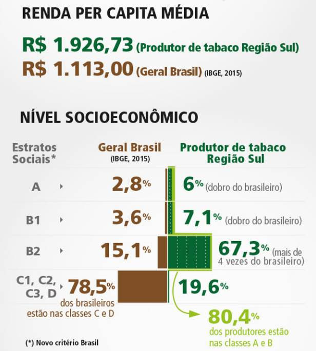 O bom padrão socioeconômico dos produtores de tabaco ficou evidenciado no estudo. Enquanto 80,4% dos produtores de tabaco enquadram-se nas classes A e B, a média geral brasileira não chega a 22%.