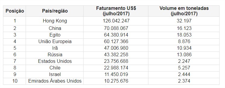 Hong Kong e China foram os maiores importadores de carne bovina brasileira no período, ambos com resultados positivos no comparativo contra junho, 5% e 6,5% respectivamente em valores exportados (US$). Entretanto, o mercado proeminente do mês foi o Egito, que registrou aumento de 38% em volume (18 mil toneladas) e de 36% em faturamento (US$ 64 milhões).