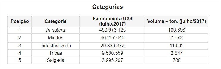 Além disso, as exportações de carne bovina in natura tiveram aumento de 38,5% na comparação com julho de 2016, alcançando US$ 451 milhões em faturamento. Em volume foram mais de 106 mil toneladas, o que representa uma alta de 29,5% sobre o total dos embarques realizados no mesmo mês do ano passado. Os resultados comparativos com junho desse ano também foram positivos para essa categoria, crescimento acima de 7% em faturamento e 6,8% em volume. Nos sete primeiros meses deste ano, nas exportações de carne bovina in natura, o Brasil obteve um faturamento que ultrapassa US$ 2,6 bilhões, o que indica acréscimo de 3,1% sobre o faturado no mesmo período de 2016.