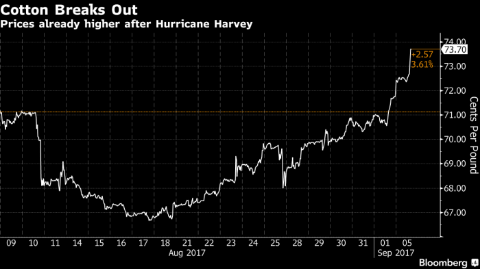 Especialistas afirmam ainda que o Irma pode voltar a castigar lavouras de algodão norte-americana, em áreas próximas ao golfo, e os campos, em muitos locais, ainda se recuperam das cheias causadas pelo Harvey na semana passada. O MDA informa também que áreas na Georgia e Carolina do Sul correm sério risco. "A previsão mostra que o furacão Irma deve atingir o Sudeste na próxima semana".