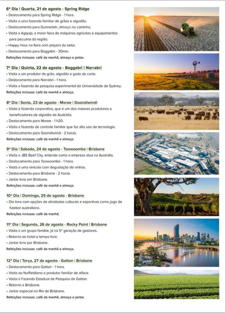 A viagem está programada para sair do Brasil no dia 16 de agosto e terá como primeira parada a Austrália. Com cerca de 25 milhões de habitantes e restrições climáticas, o país aprendeu a lidar com as restrições de disponibilidade de água e mão-de-obra investindo em inovação e tecnologia, se tornando uma das referências de competitividade e sustentabilidade na produção agrícola e pecuária. Durante a viagem, o grupo verá de perto como a Austrália conquistou competitividade no mercado de commodities buscando adicionar valor e diferenciar seus produtos no mercado externo.