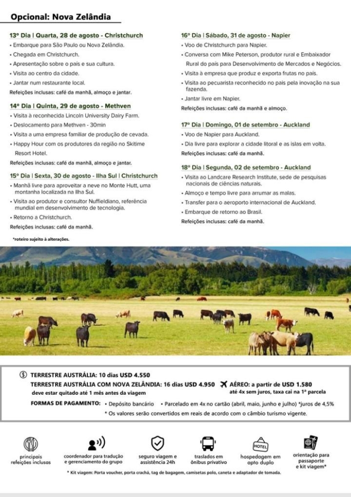 Como parte opcional da viagem, a partir do dia 28 de agosto o grupo sairá da Austrália e partirá para a Nova Zelândia, um pequeno país formado por duas ilhas principais e que possui a maior de produção de leite do mundo. Com quase 5 milhões de habitantes, em 2016/17 foram produzidos 21 bilhões de litros de leite no país. O grupo conhecerá como é feito o processo de toda a cadeira de pecuária de leite no país, além de explorar os pontos turísticos da Nova Zelândia.