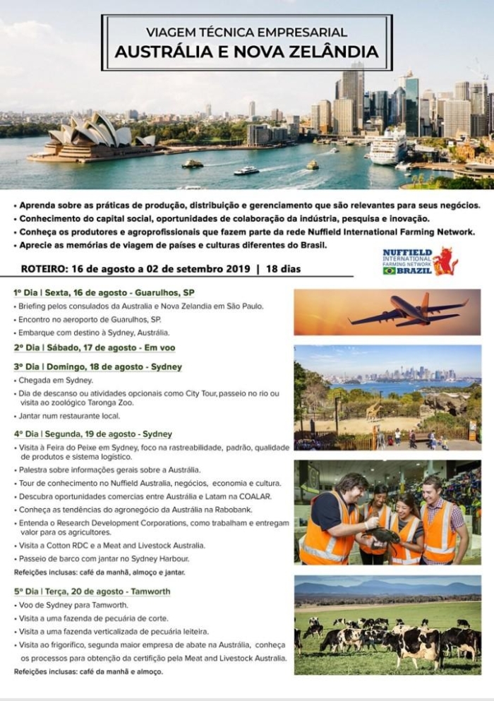 De 16 de agosto a 02 de setembro, o site Notícias Agrícolas, em parceria com a Nuffield Brasil, participará de uma viagem técnica que passará pelos principais pólos agropecuários da Austrália e da Nova Zelândia. Em todos os pontos da viagem, o grupo buscará as últimas informações e novidades sobre as lavouras australianas e neozelandesas, passando também por institutos de pesquisa e pontos turísticos dos dois países.