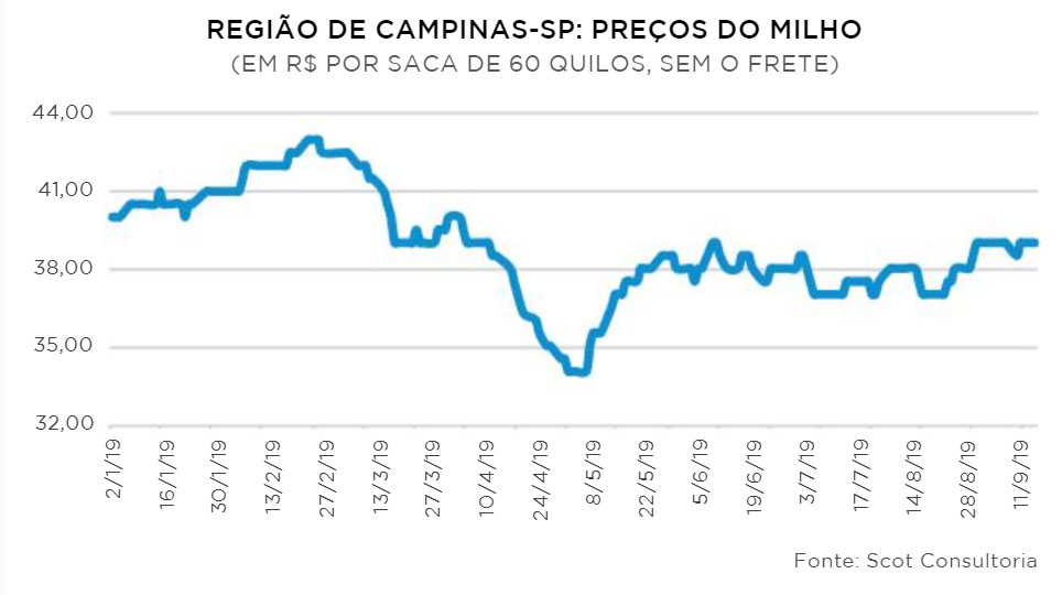 A cotação do milho no País caiu em julho e nas primeiras semanas de agosto, devido à conclusão da colheita da segunda safra 2018/19, o que aumentou a disponibilidade interna. No entanto, após esses recuos, os preços estiveram ?rmes em setembro, acompanhando o bom ritmo das exportações e o dólar em patamar acima de R$ 4,00. Segundo um levantamento da Scot Consultoria, a saca de 60 quilos ?cou cotada em R$ 39,00 na região de Campinas-SP, frente a negócios em até R$ 37,00 em meados do mês anterior.