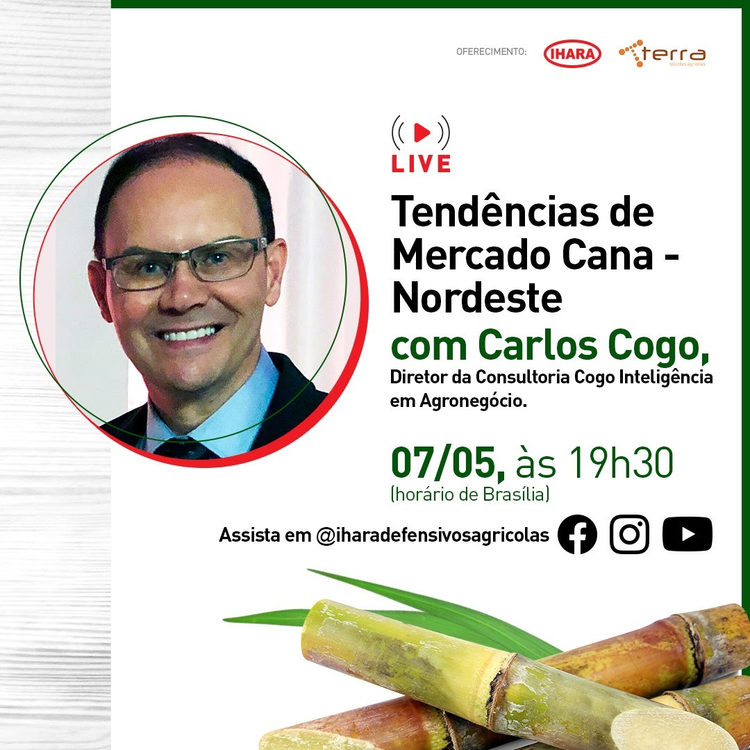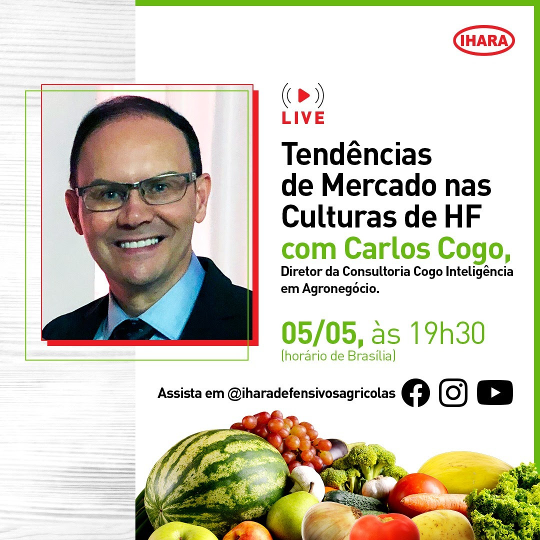 Sempre às 19h30, no dia 5 o tema da live será "Tendências de Mercado na Cultura de HF", liderada pelo gerente de Marketing de Culturas da IHARA, Breno Bezerra, e com a participação de Carlos Cogo, diretor da Consultoria Cogo Inteligência em Agronegócio. Já no dia 7, o assunto é "Tendências de Mercado na Cultura da Cana para a Região Nordeste", que será mediada pelo gerente de Marketing de Culturas da IHARA, Gustavo Canato, e também contará com a participação de Carlos Cogo.
