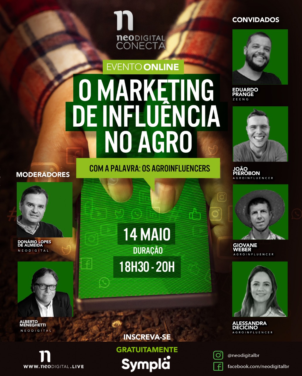 Além da classificação geral, o Report apresenta uma análise por rede social, oportunizando uma visão comparativa direta dos influenciadores do Agro, e será apresentado no evento Neodigital Conecta, nesta próxima quinta-feira, 14/5, as 18:30h. No evento serão debatidas as estratégias de uso do marketing de influência e oportunidade para marcas e empresas do mundo do Agronegócios.