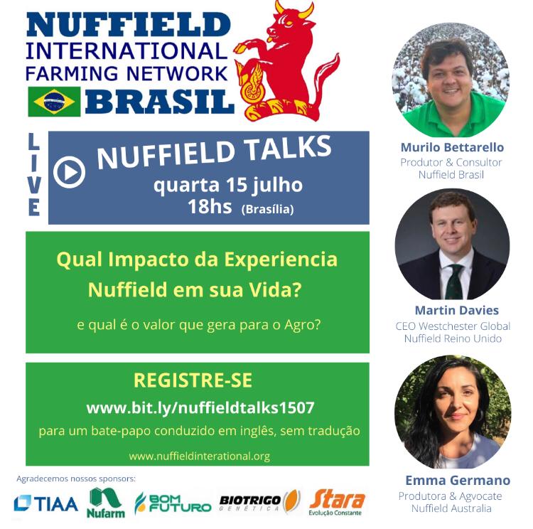 Quarta-feira (15/julho) às 18hs de Brasília, no NUFFIELDTALKS internacional será debatido sobre “Qual Impacto a Experiência Nuffield em sua Vida? E qual é o valor que gera para o agro?". Para o debate, o evento contará com  3 painelistas que contarão suas experiência, vivências e visões de terem passado por uma bolsa internacional, voltada para o crescimento sustentável do agronegócio.