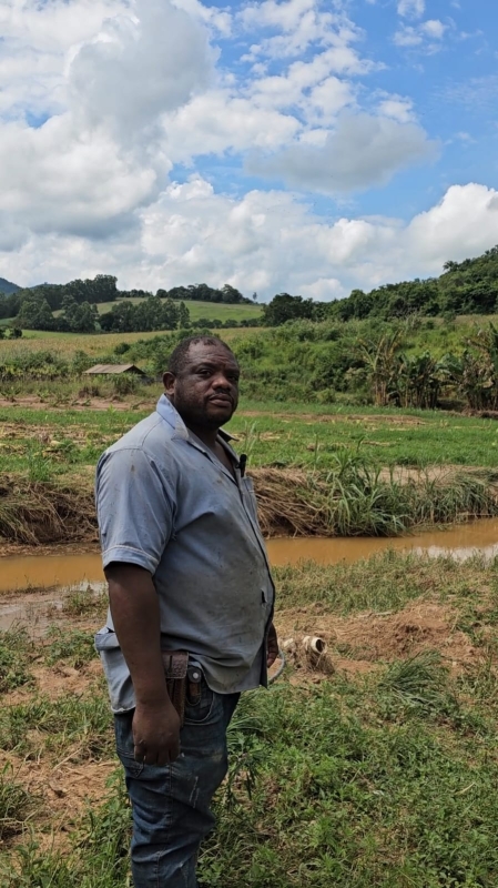 Luiz Fernando olha com desgosto para a área onde há dez dias havia duas mil covas de banana. A chuva da noite de 23 de fevereiro encheu rapidamente o córrego Miragaia, que passa dentro da propriedade, e a força da água derrubou todo o bananal e outras plantações do produtor. “Encheu tudo, parecia um mar, e vinha forte como uma onda”, relembra. A técnica de campo Karina Soares, que atende Luiz Fernando pelo programa de Assistência Técnica e Gerencial (ATeG) do Sistema Faemg Senar, também não esconde a tristeza ao ver a situação do sítio. “Luiz Fernando é um produtor muito empenhado. Em oito meses de trabalho conjunto, conseguimos mudar muita coisa. Quando cheguei aqui e vi que toda a adubação que fizemos, o estoque de nutrientes, tanto da banana, quanto do quiabo, jiló, foi tudo levado, é desolador”.