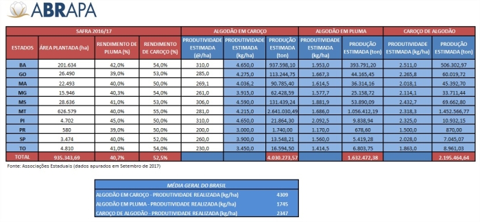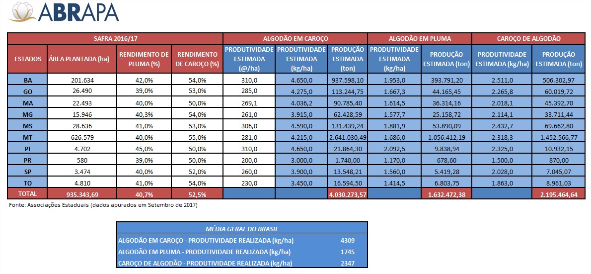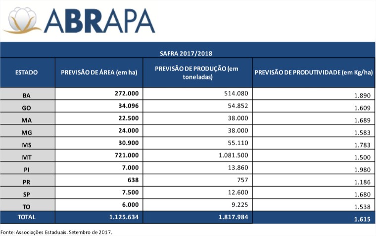 Se as estimativas da Associação Brasileira dos Produtores de Algodão (Abrapa), apresentadas na última quarta-feira (27/09) na Câmara Setorial da Cadeia Produtiva do Algodão e Derivados se confirmarem, na safra 2017/2018 a área plantada com algodão no Brasil será de 20,3% maior que no ciclo anterior, que acaba de ser concluído, e a produção, 11,3% superior. Isso corresponde a 1,1 milhão de hectares com a cultura nos dez estados produtores brasileiros que, juntos, deverão gerar em torno de 1,8 milhão de toneladas de pluma, com produtividade média de 1,6 mil quilos por hectare. Os dados foram divulgados, durante a 48a reunião da Câmara, realizada na sede do Ministério da Agricultura, Pecuária e Desenvolvimento (Mapa), com presença dos representantes das associações estaduais de produtores de algodão e dos demais elos da cadeia produtiva da pluma.