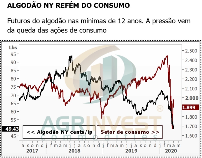 Em uma dia de baixas generalizadas nas commodities nesta quarta-feira (1), os futuros do algodão negociados na Bolsa de Nova York lideraram as baixas entre as agrícolas e registram suas mínimas em 12 anos. A pressão maior vem dos desdobramentos da pandemia do coronavírus, que ameaçam o consumo com milhões de pessoas em isolamento social por todo o mundo.