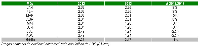 O valor pago pelo litro de biodiesel vem seguindo uma trajetória descendente. O valor médio do litro negociado no 31º Leilão de Biodiesel ANP, cujos volumes serão entregues entre os meses de julho e agosto de 2013, foi de R$ 1,94, uma queda de 22% em relação ao mesmo período do ano passado.