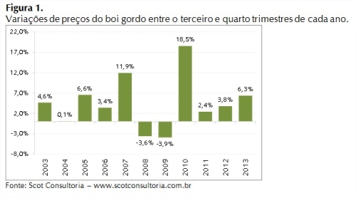 Considerando o período de 2003 a 2013, as cotações do boi gordo subiram 4,6%, em média, no último trimestre do ano, frente ao anterior, considerando preços em São Paulo.
