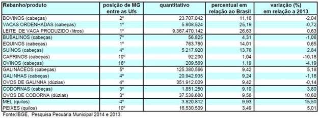 IBGE divulgou nesta quinta-feira (8/10), os números da Produção da Pecuária Municipal (PPM) em 2014. O destaque, mais uma vez, é a liderança mineira na produção de leite, com mais de um quarto do total nacional e o maior rebanho leiteiro.  O estado é também líder em rebanho equino.