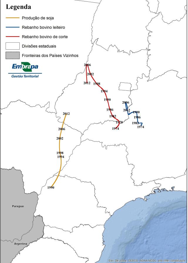 Os especialistas da Embrapa aplicaram a mesma tecnologia para a produção nacional de soja de 1990 a 2012. No caso dessa leguminosa, o estudo registrou um leve deslocamento da cultura em direção ao nordeste a partir do início da década de 2000, tendência que seguiu até a última coleta de dados, em 2012. A razão para esse comportamento da produção de soja é outro tema a ser estudado posteriormente, de acordo com Mingoti.