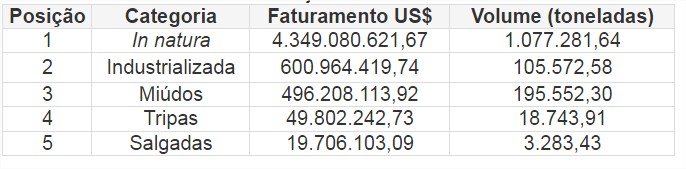 Em 2016, dentre as categorias de carne exportadas pela indústria brasileira, a in natura liderou as vendas, totalizando um faturamento de US$ 4,3 bilhões e 1,1 milhão de toneladas embarcadas de janeiro a dezembro.