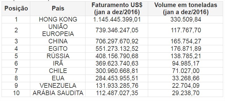 As exportações brasileiras de carne bovina fecharam o ano de 2016 com faturamento de US$ 5,5 bilhões. De janeiro a dezembro, foram embarcadas mais de 1,4 milhão de toneladas. Em comparação com o ano anterior (2015), o volume embarcado teve um aumento de quase 1%. Porém, o faturamento registrou uma retração de 7%.