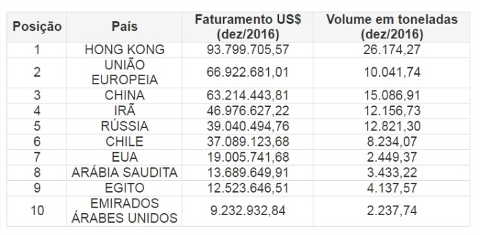 Se considerado somente o mês de dezembro de 2016, o faturamento das exportações de carne bovina brasileira registrou US$ 455 milhões em vendas externas, um aumento de 7,4% em relação a novembro de 2016. Já em volume embarcado, foram 113,4 mil toneladas, com crescimento de 13,8% se comparado com o mês anterior.