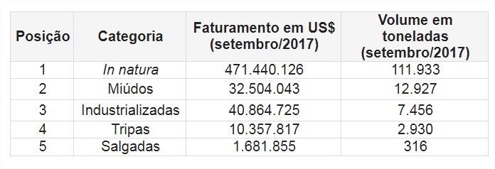 O ranking de categorias mais exportadas ainda aponta, em sequência, miúdos (12.927 toneladas embarcadas), industrializadas (7.456 toneladas), tripas (2.930 toneladas) e salgadas (316 toneladas).