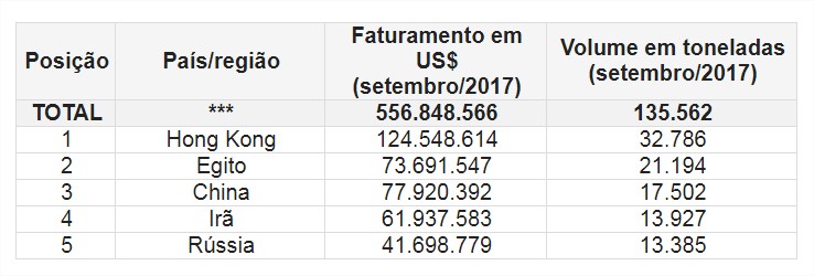 Hong Kong continua sendo o principal importador da carne bovina brasileira, responsável pela compra de 32.786 toneladas (56% a mais do que o comercializado em agosto), seguido por Egito, que importou 21.194 toneladas (aumento de 5,34%), e China, com 17.502 toneladas (alta de 10,98%).