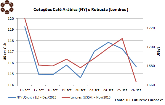 Na Bolsa de Londres, referência para os preços da variedade robusta, houve desvalorização de US$ 15 por tonelada no vencimento novembro do contrato 409, no acumulado da semana até o fechamento de ontem. Paira sobre o mercado a expectativa da entrada dos grãos da safra 2013/14 do Vietnã, de forma que poucos negócios foram concretizados. Houve oferta dos primeiros grãos vietnamitas a prêmio de US$ 10/t sobre o segundo vencimento do contrato 409, mas exportadores mantiveram-se cautelosos, à espera de maior volume a partir de novembro e também em função de incertezas quanto ao reembolso de impostos pagos ao governo do país asiático.