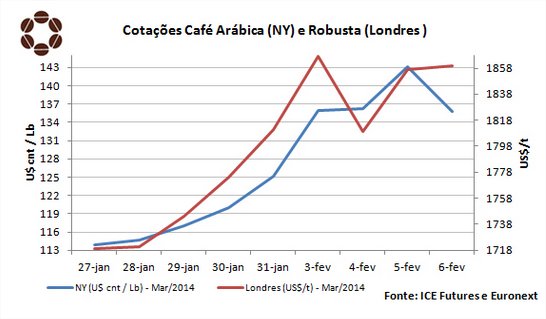 A valorização das cotações do arábica refletiu positivamente no comportamento dos preços futuros do robusta na Bolsa de Londres. Na quinta-feira, a cotação de fechamento do vencimento março de 2014 do contrato 409 da NYSE Liffe foi de US$ 1.860 por tonelada, representando alta acumulada de US$ 49 desde o início da semana.