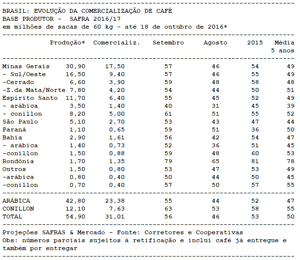 Segue tabela com levantamento de comercialização da safra 2016/17, tomando-se por base a estimativa de SAFRAS para a produção, até 18 de outubro: