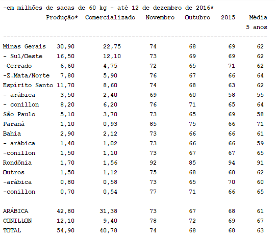 Segue tabela com levantamento de comercialização da safra 2016/17, tomando-se por base a estimativa de SAFRAS para a produção, até 12 de dezembro: