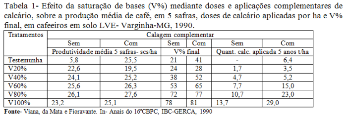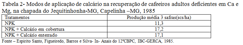 O preparo apenas do sulco tem as vantagens - de manter a estrutura do solo, permitindo maior armazenamento de água, de diminui a probabilidade de erosão e de reduzir o custo com despesas nas operações mecanizadas na área total. A princípio, esta pratica parecia impossível, pela necessidade de incorporação do calcário em área total, através da aração/gradagem. Porem, as pesquisas mostraram que é possível ir corrigindo o solo gradualmente, começando pelo sulco, conforme o usual, mais aplicações complementares anuais, em faixa, na linha de plantas, ampliada na medida em que os cafeeiros vão crescendo. A aplicação complementar traz, também, economia no custo desse insumo. As tabelas 1 e 2 mostram resultados de aplicação inicial e complementar de calcário e efeito da aplicação de calcário em cobertura e enterrado. No mesmo sentido, diante de resultados de análise química do solo, pode-se dispensar esse corretivo em boa parte dos novos plantios, feitos em substituição de cafezais velhos, pois essas áreas já podem estar corrigidas.