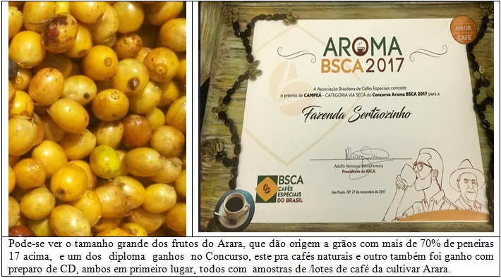 Nos aspectos de qualidade os frutos e sementes são de tamanho grande e a sua maturação é tardia. O destaque de qualidade da bebida vinha sendo comentado por profissionais classificadores de café, porem a prova definitiva veio com a recente premiação no Concurso Aromas, da BSCA- Associação Brasileira de Cafés Especiais. Neste ano, em 2 lotes oriundos de uma área cultivada com a cultivar Arara, no sistema orgânico, na Fda Sertãozinho, em Botelhos-MG, os cafés da Cultivar Arara ganharam os primeiros prêmios, tanto nos cafés preparados no processo natural, quanto no processo de cereja descascado-CD. Mais ainda, com pontuação recorde, de 94 pontos.