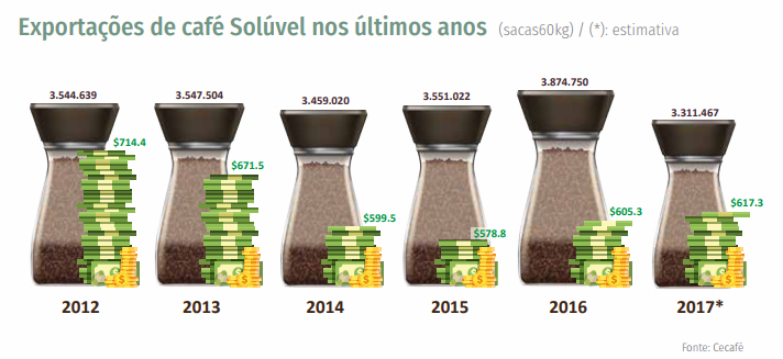 O Brasil, desde a implantação do parque industrial de café solúvel, no início da década de 1960, tem se mantido na liderança mundial de produção e exportação do setor. Nos últimos anos, passou a enfrentar a intensa concorrência de indústrias da Ásia, coincidente com o grande aumento da produção de cafés robustas no continente, devido ao crescimento do consumo interno dos países da região, que estimulou o processo de montagem de novas plantas de café solúvel.