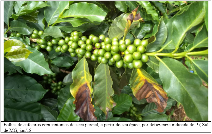 No último ano, vem aparecendo, em maior  escala, uma seca parcial de folhas velhas de cafeeiros, indicando,  pelos sintomas típicos, uma deficiência de fósforo induzida, mas surgem duvidas sobre as causas desta ocorrência.