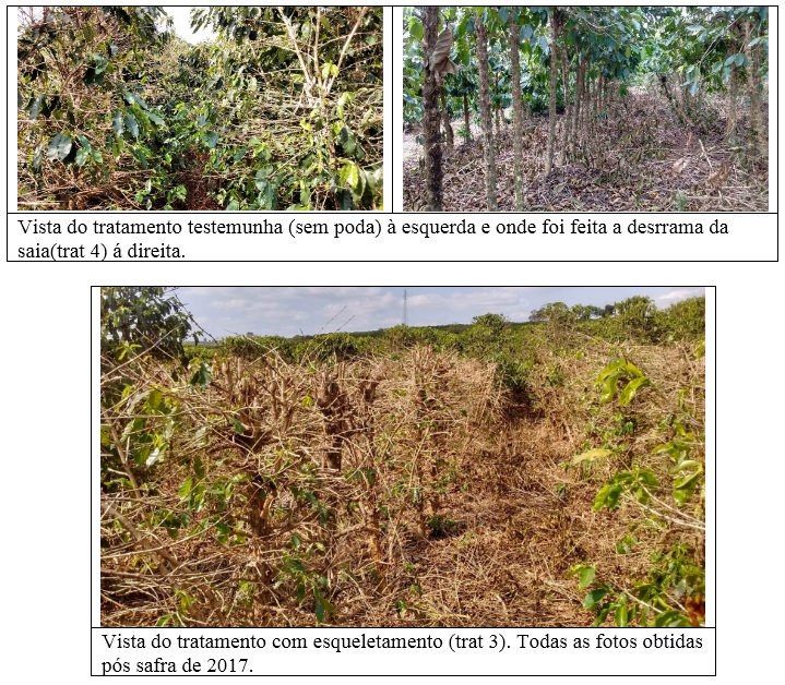 Os 4 tratamentos ensaiados foram - (1) testemunha, onde a lavoura não foi podada, (2) esqueletamento total das plantas, onde foram cortados os ramos plagiotrópicos a uma distância de 30 cm do tronco e realizado um decote destas plantas a 1,70 m de altura, (3) esqueletamento da saia do cafeeiro, onde o corte dos ramos plagiotrópicos foi realizado somente na metade inferior das plantas deixando o topo das plantas sem cortar e o tratamento (4) chamado de desrrama da saia, onde foram arrancados os ramos plagiotrópicos da metade inferior destas plantas, deixando o tronco livre na parte baixa. Foram obtidos resultados do 1º ciclo, com 2 safras úteis, prevendo-se condução por mais outro ciclo.