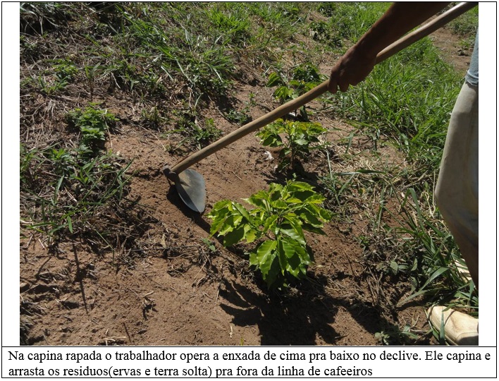 A capina rapada é feita com o trabalhador manejando a enxada de cima pra baixo, quando a capina ideal seria operando em nível, andando lateralmente e deixando o mato e a terra solta no local capinado, não arrastando os mesmos pra fora da linha capinada.