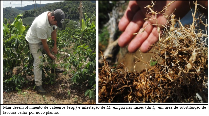 Observações de campo mostram que em replantios de cafeeiros, em lavouras infestadas pelo nematoide M. exígua, a gravidade da infestação nas plantas novas é menor, quando em comparação com a substituição total da lavoura.