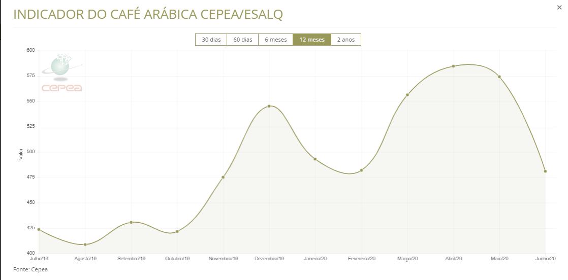 Veja o gráfico de preços do indicador Cepea para o café no Brasil nos últimos 12 meses: