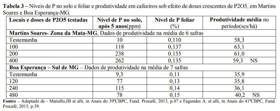 Finalmente, a tabela 3 mostra os resultados de ensaios com aplicação de doses crescentes de P2O5 em cafeeiros em duas regiões típicas de cafeicultura. Verifica-se que não foram obtidas respostas de aumento de produtividade, mesmo os solos originais tendo níveis baixos de P, pela análise usual e, ainda, mesmo com avaliação em elevado número de safras, onde foram repetidas, anualmente, aplicações das doses testadas.