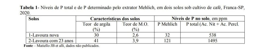 Dois estudos recentes avaliaram o nível de fósforo total e aquele determinado por análise usual de solo. Na Zona da Mata de Minas verificou-se, na média de 16 amostras, um nível de 336 ppm de P total, contra 6,9 ppm pela análise com o extrator Mehlich, presumidamente o P solúvel. Em Franca (SP), foram avaliados dois solos com cafezais, uma área de plantio mais recente, com lavoura aos 2,5 anos de idade, e outra com lavoura de 23 anos de cultivo. A tabela 1 mostra os teores de P encontrados em amostras de 0-20 cm, nas duas condições de lavouras.