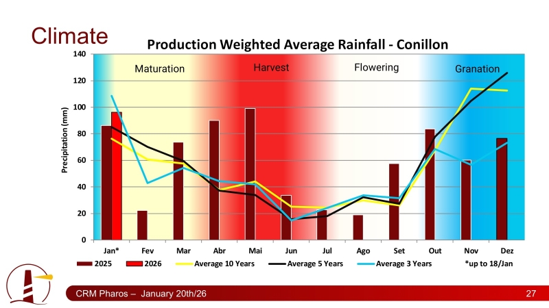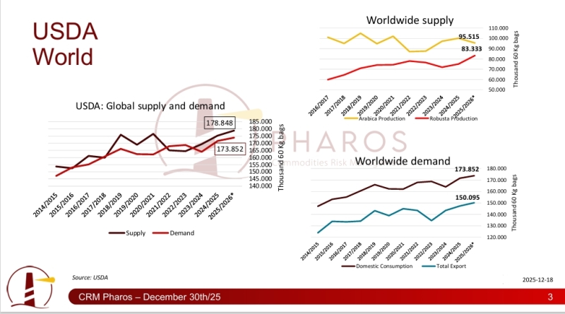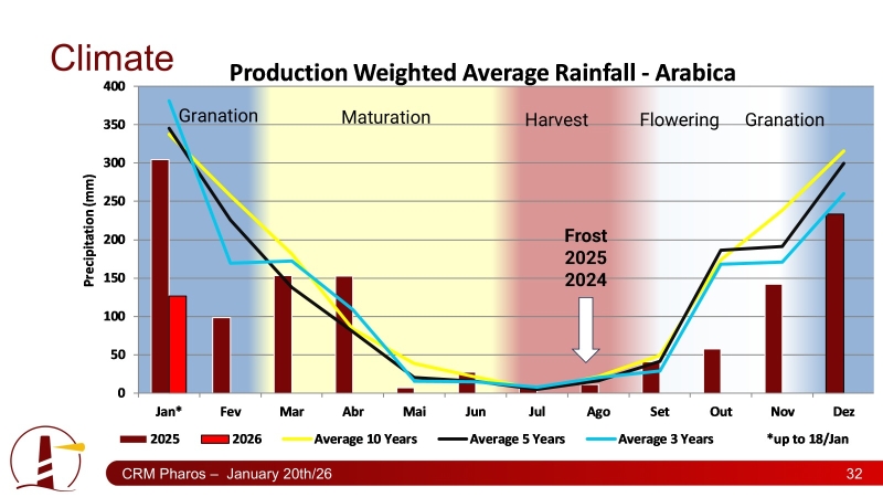Segundo estimativas da Hedgepoint Global Markets, as chuvas registradas durante os meses de outubro e novembro de 2025 no Brasil favoreceram a floração do arábica, enquanto o conilon manteve bom desenvolvimento nas principais regiões produtoras. Diante deste cenário, a companhia projeta que o país pode produzir entre 71 e 74,4 milhões de sacas em no ciclo 2026/27.