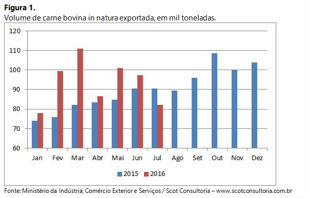 Segundo dados do Ministério da Indústria, Comércio Exterior e Serviços, em julho foram exportados 82,2 mil toneladas de carne bovina in natura, uma média diária de 3,9 mil toneladas.