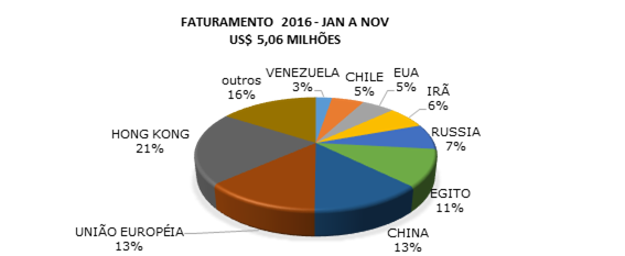 No total, de janeiro a novembro de 2016, o Brasil exportou US$ 5 bilhões (US$ 423 milhões em exportações no mês de novembro). Em volume, com o embarque de 99,6 mil toneladas de carne bovina em novembro, o acúmulo (jan. a nov.) é de 1,3 milhão de toneladas no ano de 2016. Esses números representam um aumento de 1,7% em volume e queda de 6% em faturamento em relação a 2015.