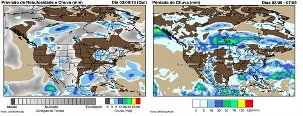 Para os Estados Unidos, a quinta-feira será de tempo aberto e chuvas, apenas na forma de pancadas isoladas. Mas como ocorrerá no Brasil, as chuvas também voltarão para as principais regiões produtoras na semana que vem, sendo que na segunda semana de setembro há previsões de chuvas amis volumosas, frequentes e com maior abrangência e esse padrão deverá persistir ao longo do mês. Não vejo grandes problemas para a colheita, apenas irão ocorrer problemas pontuais, sem grandes impactos à produtividade e consequentemente à produção total de soja e milho norte-americana. Assim, mesmo com essas previsões de chuvas para os meses de setembro e outubro, a produção de grãos deverá bater recordes esse ano, principalmente de soja.